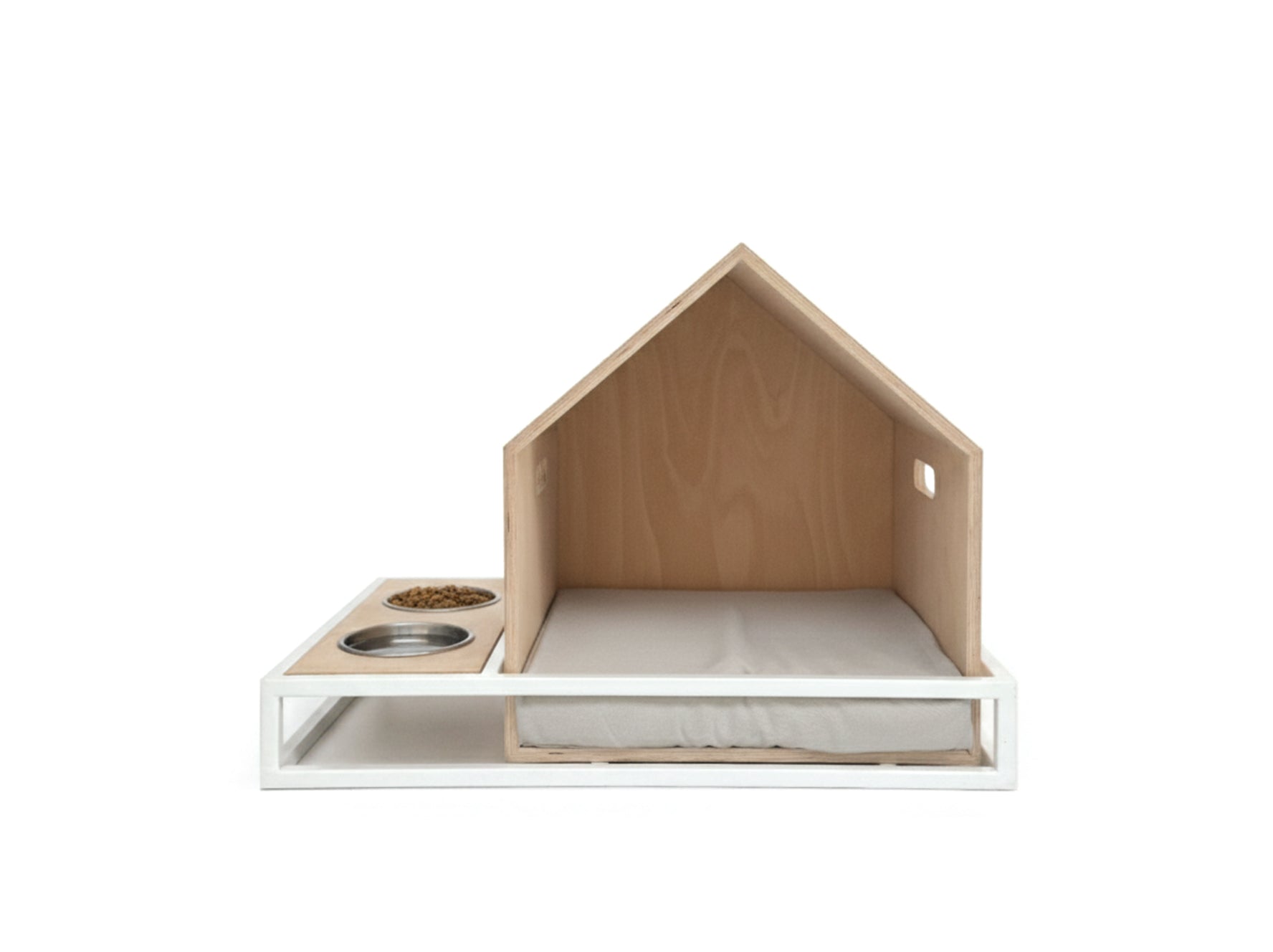 Sert ve neme dayanıklı metal gövdesi, huş kontrplak tepsili paslanmaz mama ve su kabı ile hem iç, hem dış mekan kullanımına uygundur.